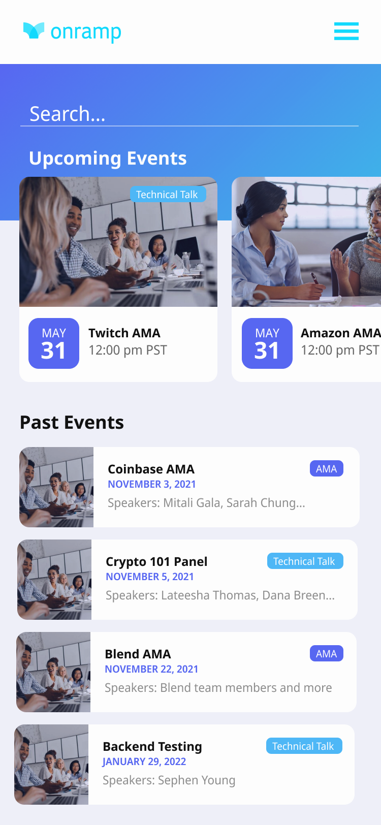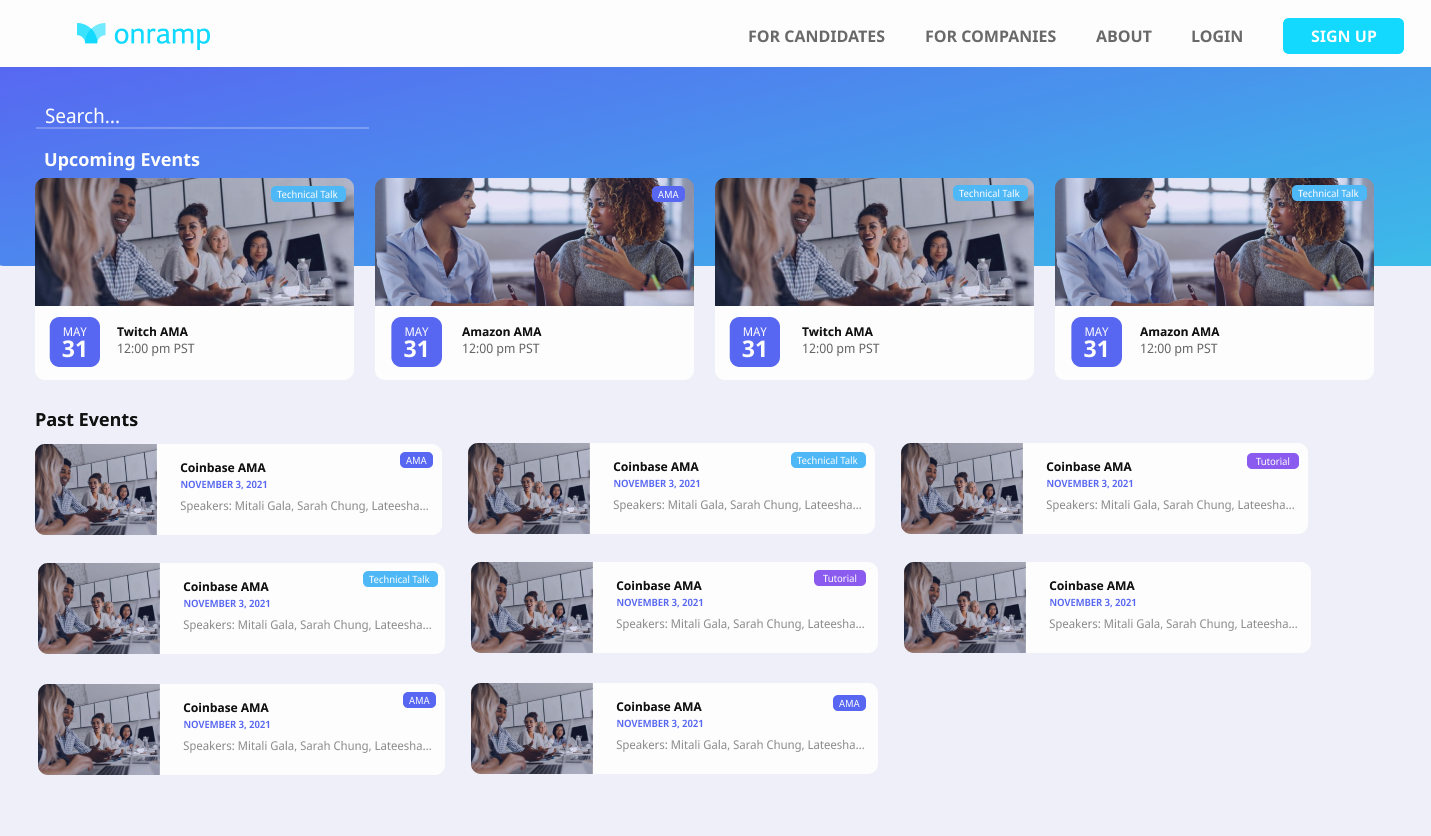 The Events Page final designs, which were linked from the Onramp homepage included: