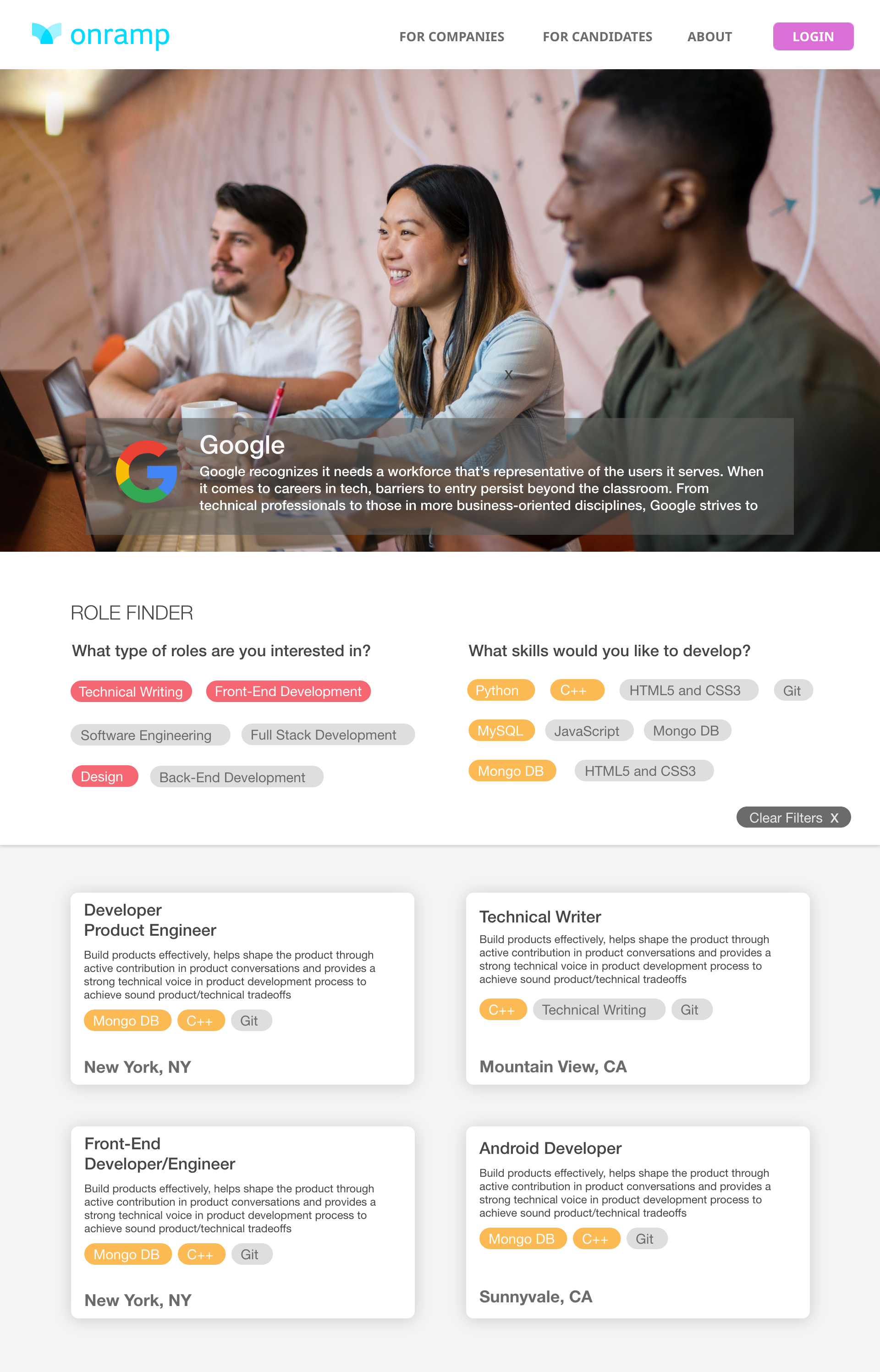 Onramp was a startup connecting non-traditional tech talent (non-degree holders) to apprenticeships at companies like Google, Amazon, Twitch and more.